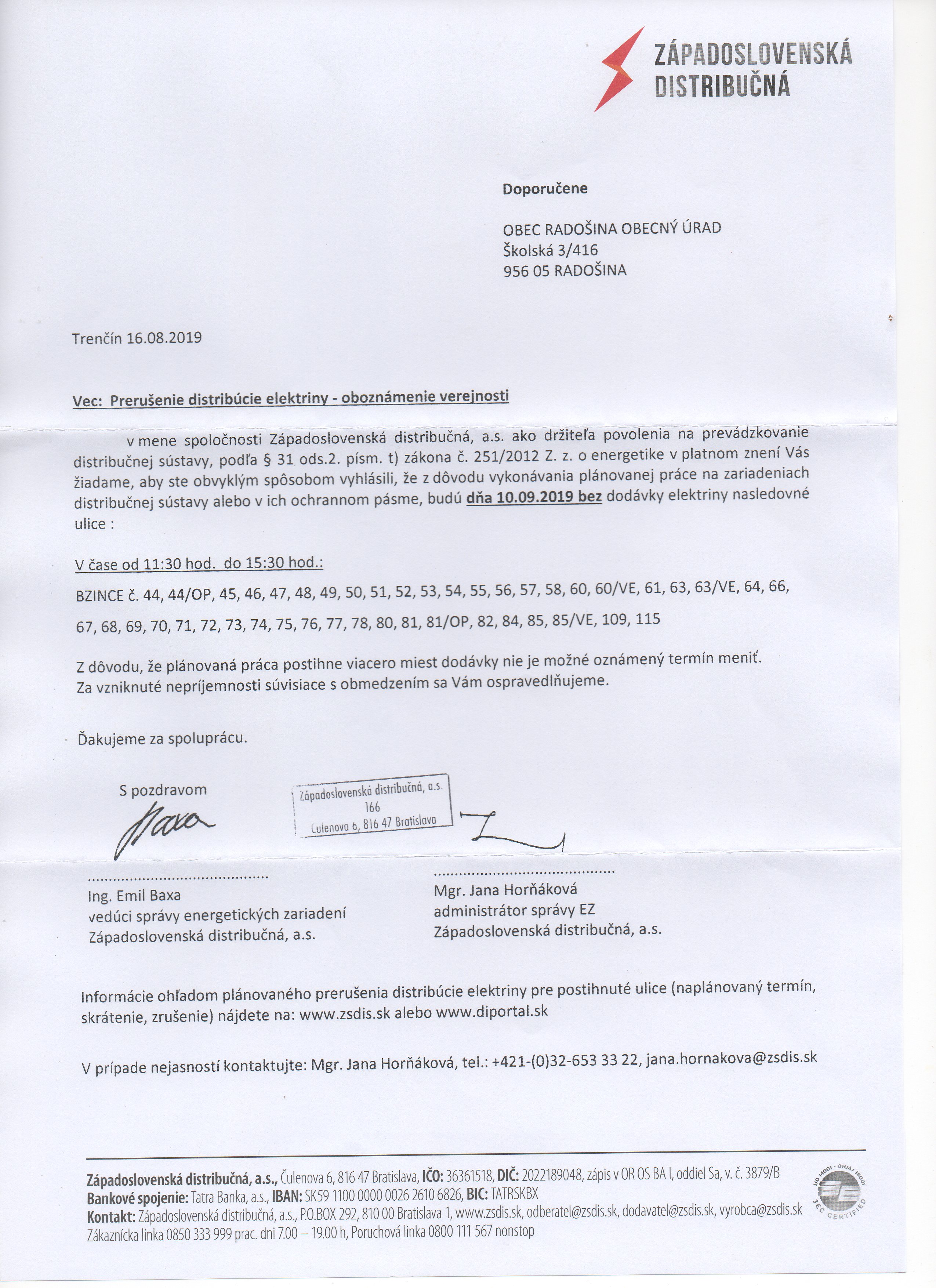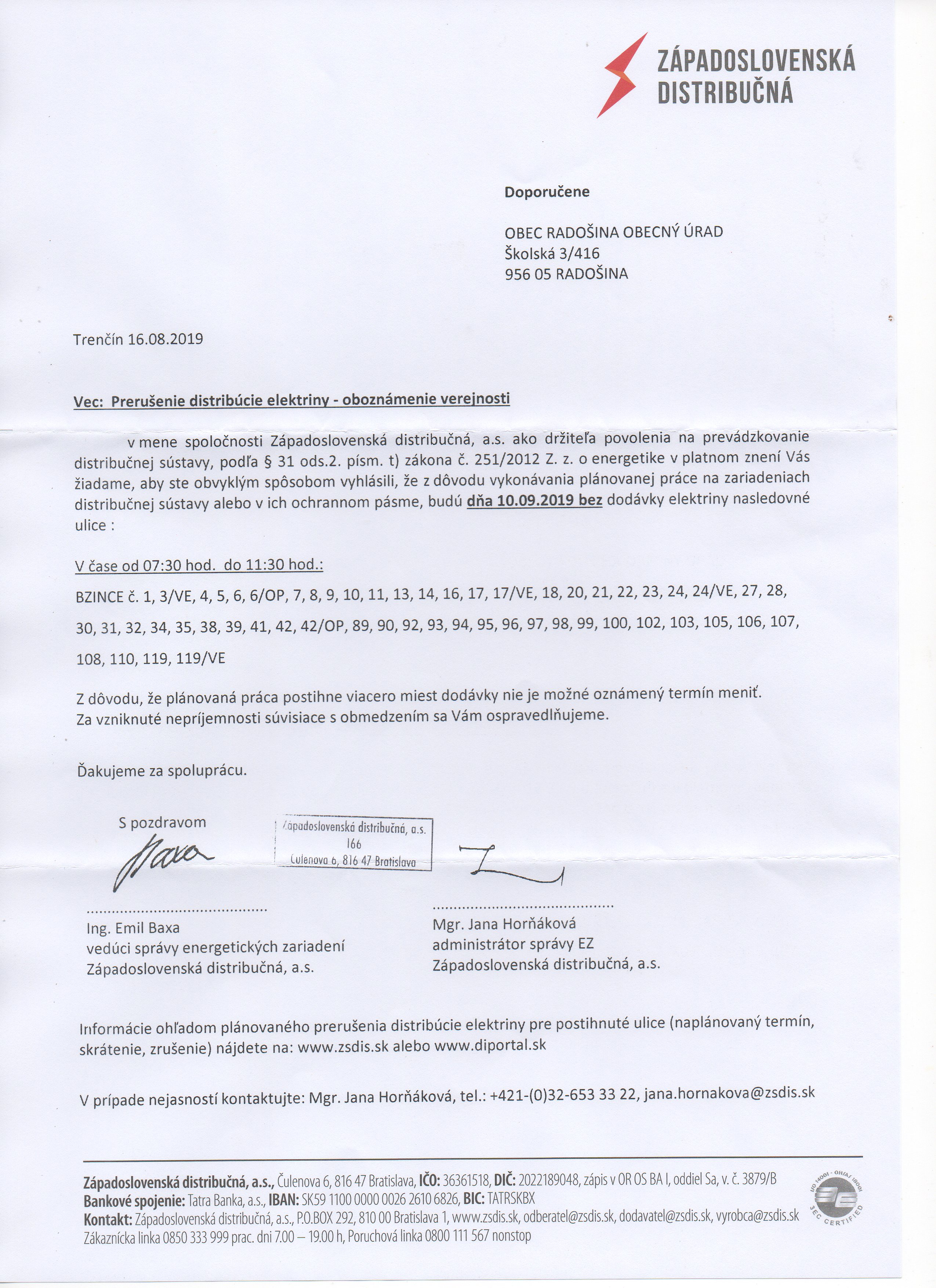 Dňa 10.9.2019 v Bzinciach nebude elektrina. Podrobný rozpis domov nájdete v priložených dokumentoch